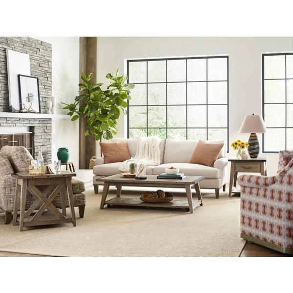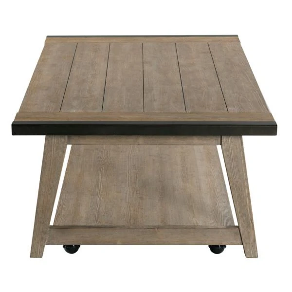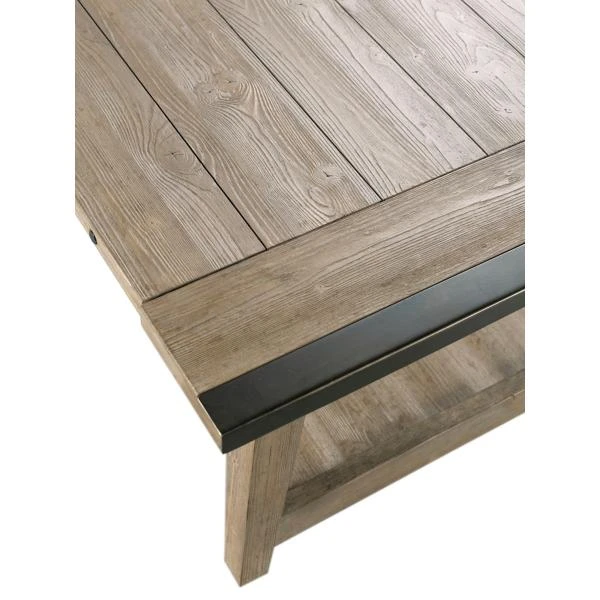 The Urban Cottage Brixton Coffee Table by Kincaid is crafted of New Zealand pine with select solid hardwoods and finished in a wire brushed Harvest finish. The coffee table features metal accents with a light antique bronze finish, nail trim, an open bottom shelf and casters.