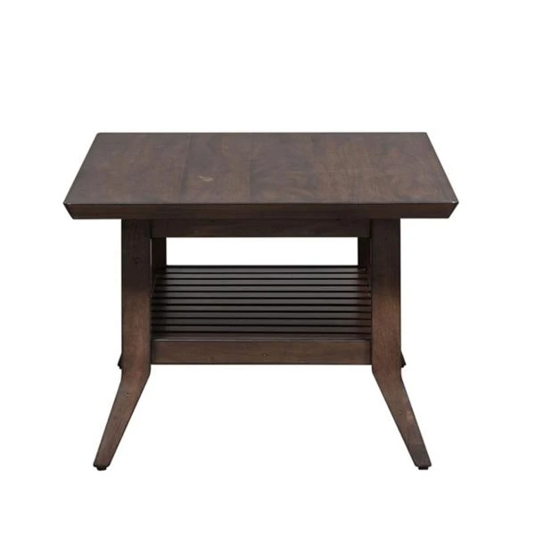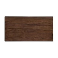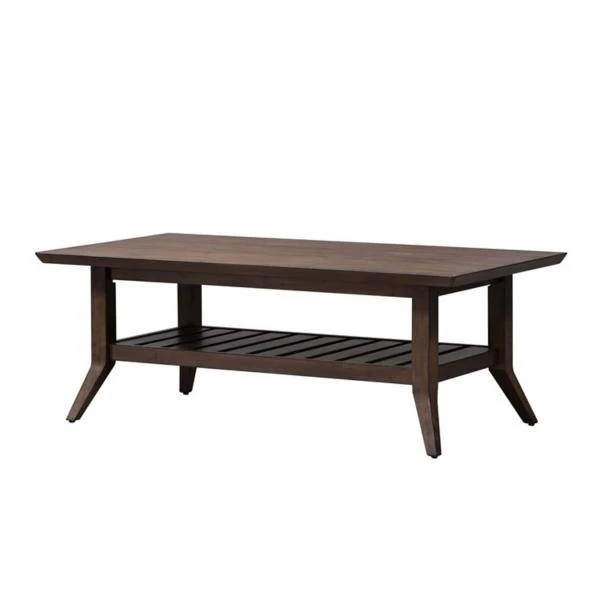 The Ventura Boulevard Rectangular Coffee Table is crafted of rubberwood solids and cathedral walnut veneers that’s finished in a bronze spice color. It features a slat shelf and tapered splayed legs.
