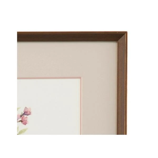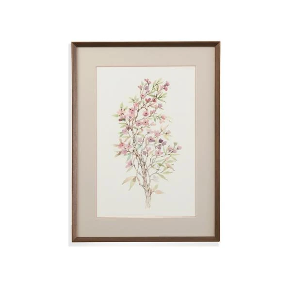 Watercolour Foliage I is a depiction of a sweet, whimsical hand painted bouquet of pink flowers. It is finished with a double mat and a 3/4″ brushed gold frame with grey wash molding under glass. Made in the USA, D-ring or sawtooth picture hanging hardware included. It can be hung individually, or paired with its companion print, Watercolour Foliage II.