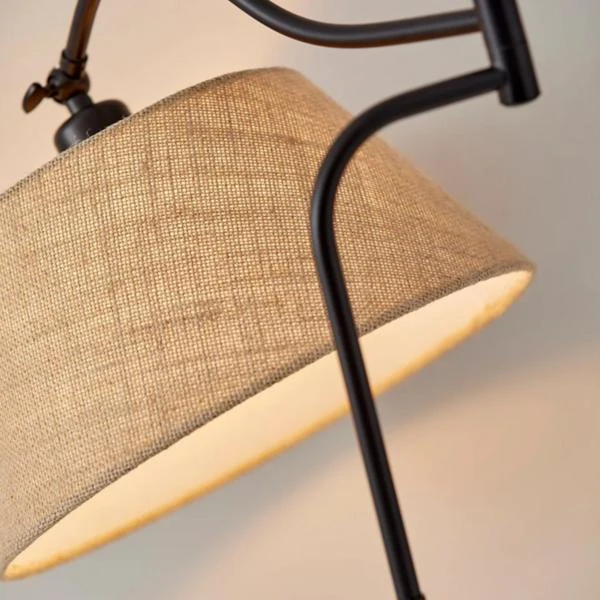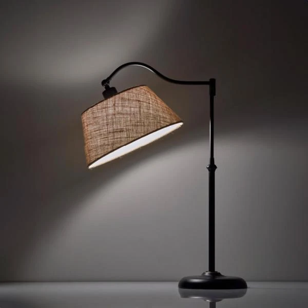The Westin Table Lamp features a modernized take on the traditional bridge lamp, including a swing arm that can be adjusted. A textured burlap fabric shade brings warmth to the design and may be adjusted vertically and secured with a locking key joint. In addition, lamp features an antique bronze finish an on/off rotary switch located above the socket. Uses (1) 60 watt max light bulb.