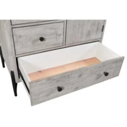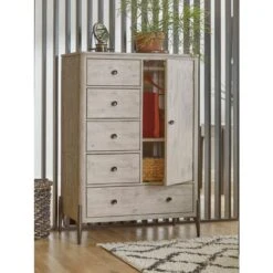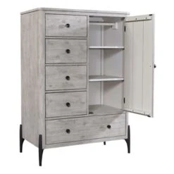The Zane Chifforobe is crafted of Acacia wood with veneers. Parchment finished case with contrasting Matte Black finished metal legs. The Chifforobe features 5 drawers, matte black finished pulls, felt lined top drawers and cedar lined bottom drawers. Door opens to 2 adjustable shelves, a removable clothing rod and jewelry hooks.
